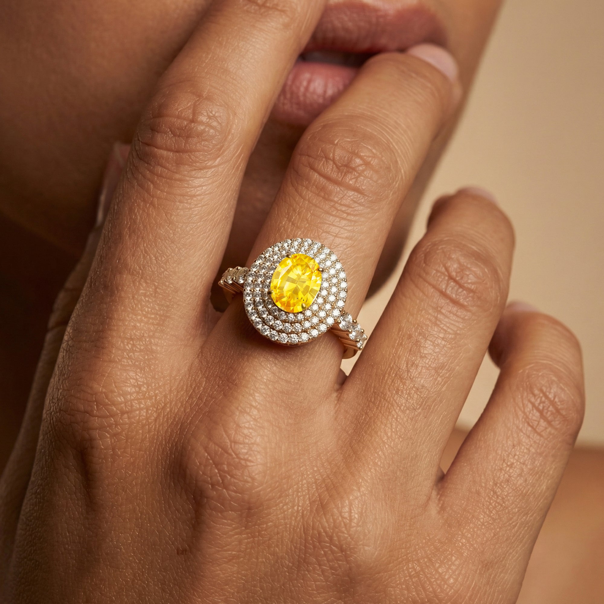 Triple Halo Diamond Oval Cut Yellow Sapphire Cocktail Ring