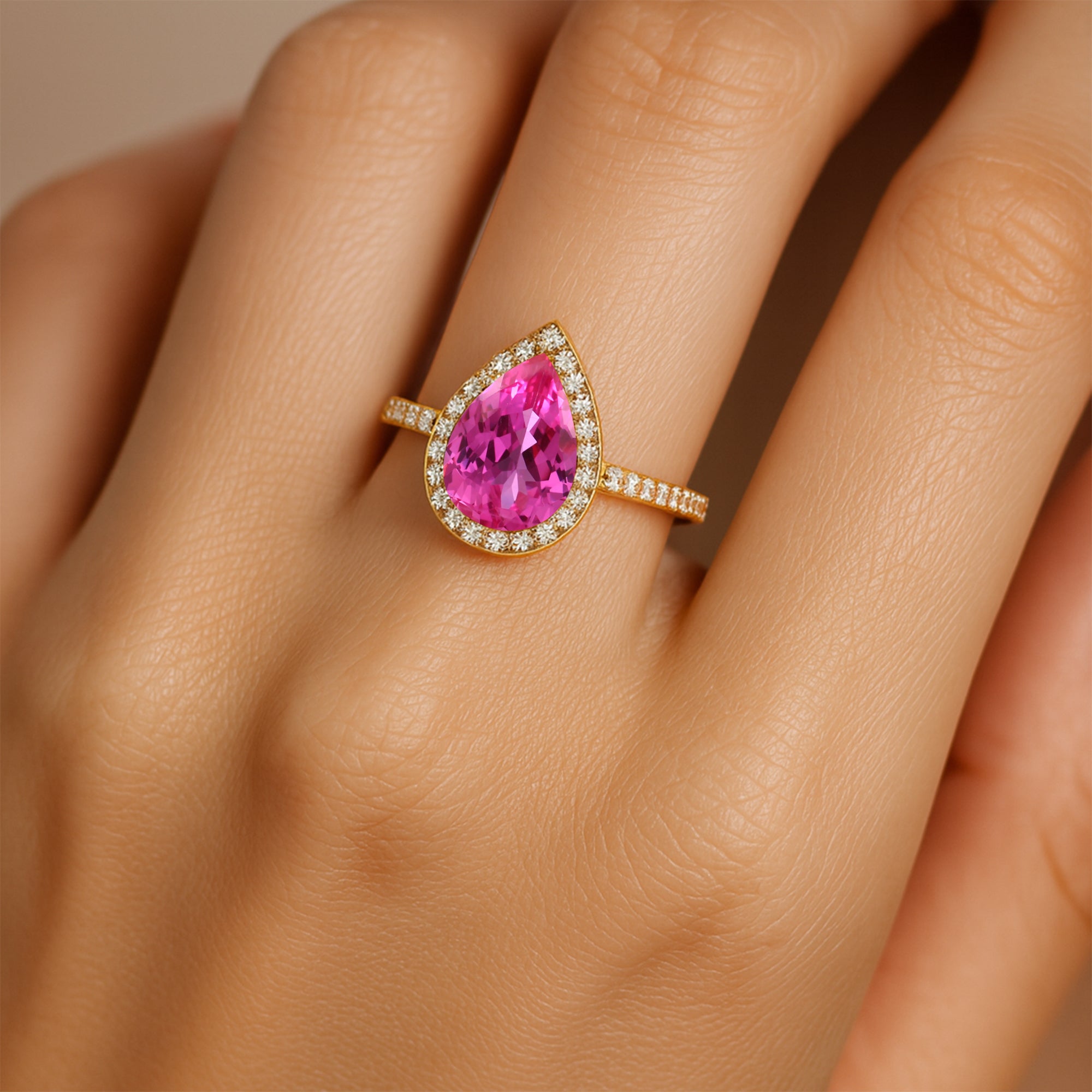 Classic Pear Shaped Pink Sapphire Halo Diamond Engagement Ring