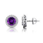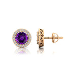 Round Solitaire Amethyst Halo Diamond Stud Earrings