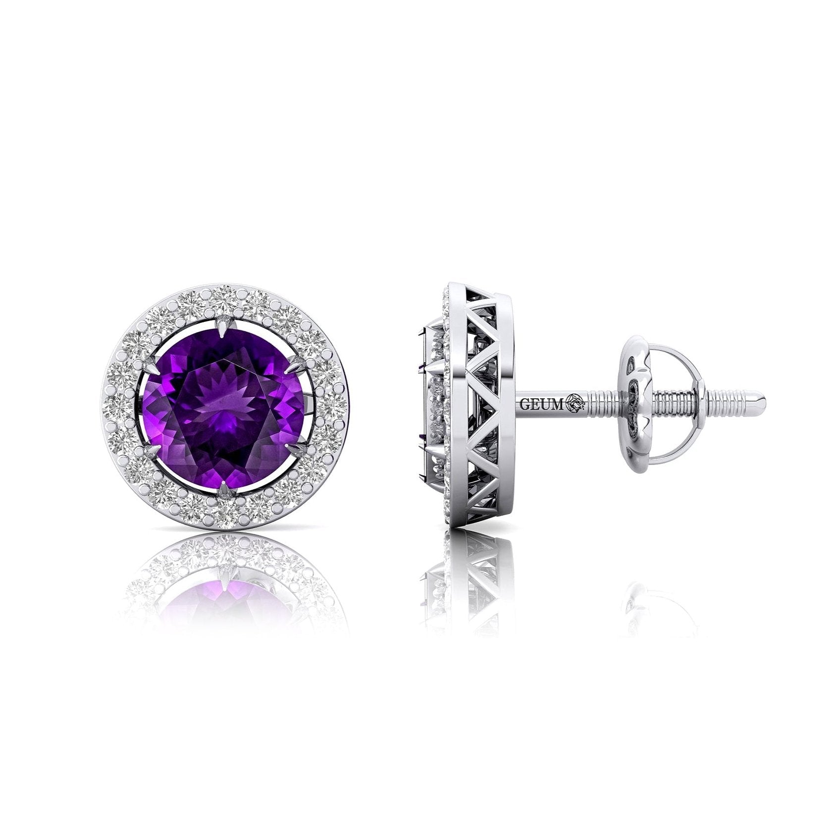 Round Solitaire Amethyst Halo Diamond Stud Earrings - GeumJewels