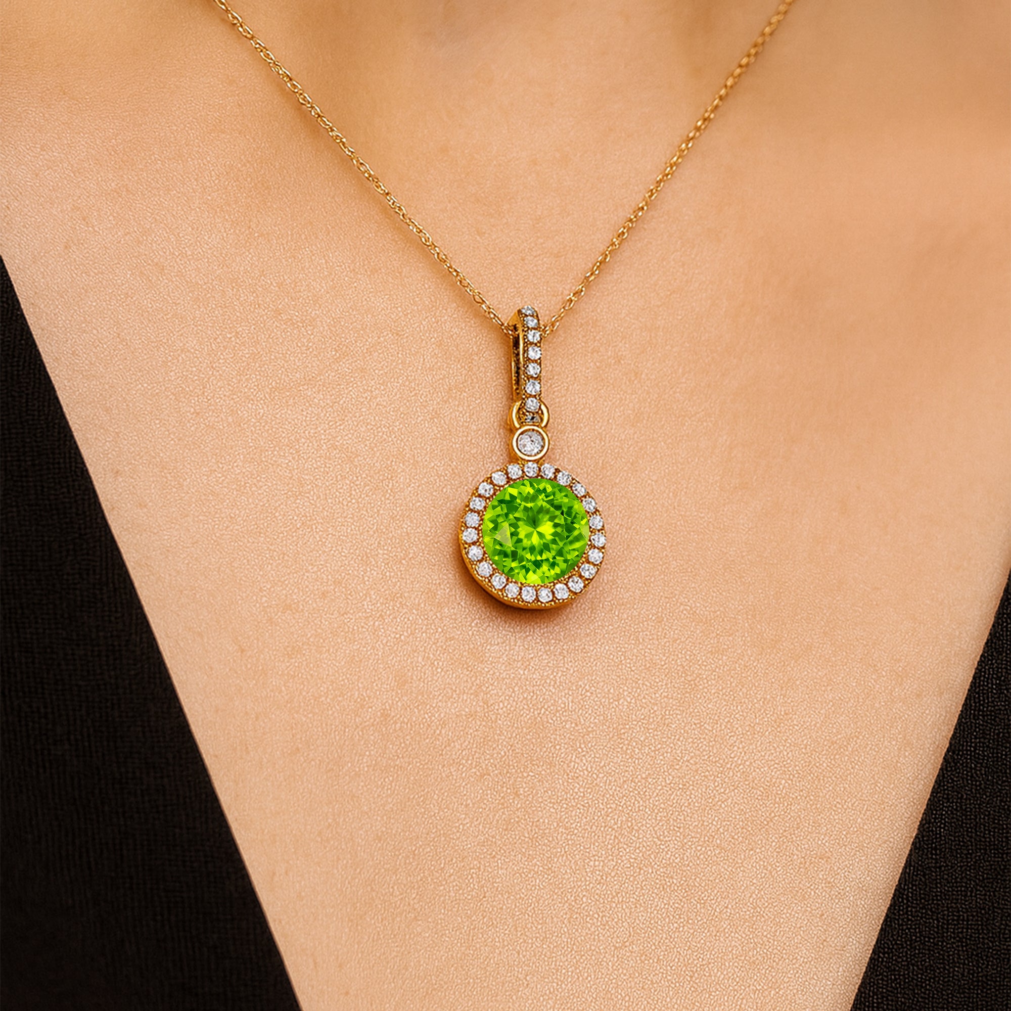 Classic Solitaire Round Peridot Halo Diamond Dangle Pendant - GeumJewels