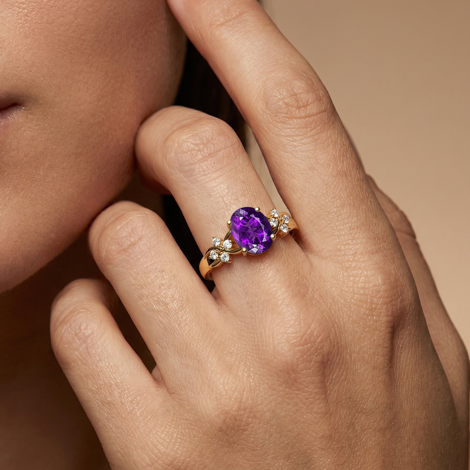 Flower Inspired Ring with Oval Shaped Amethyst and Accent Diamonds