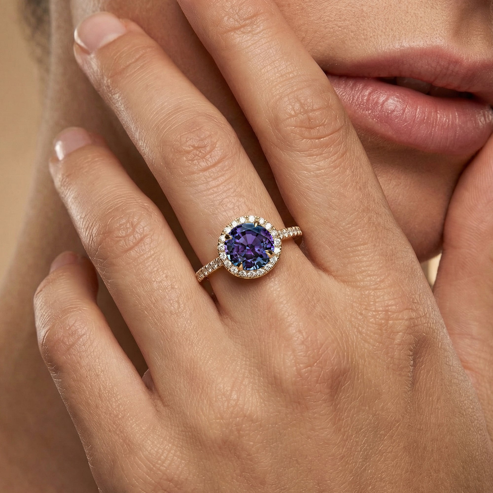 Classic Round Halo Diamonds with Solitaire Alexandrite Engagement Ring