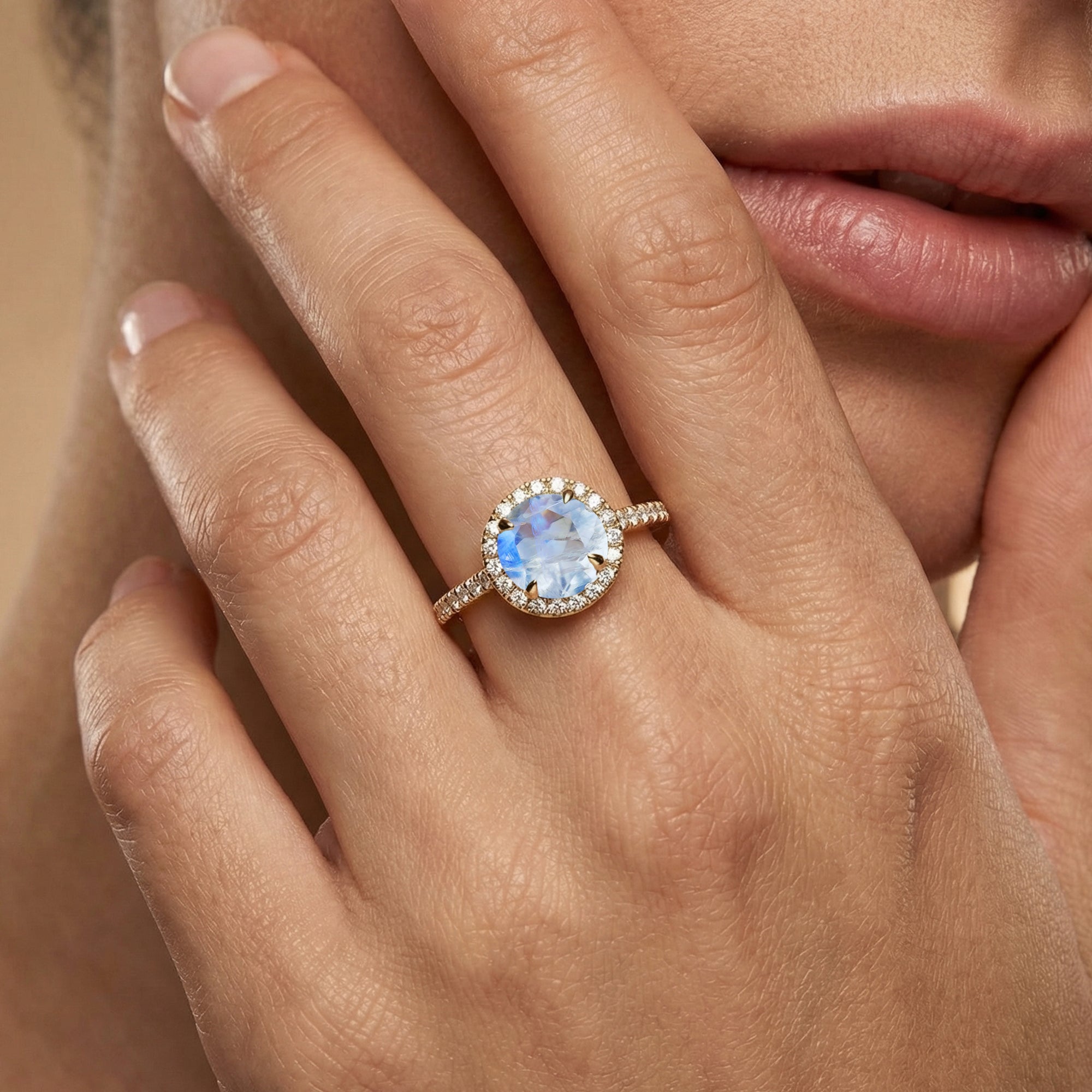 Classic Round Halo Diamonds with Solitaire Moonstone Engagement Ring