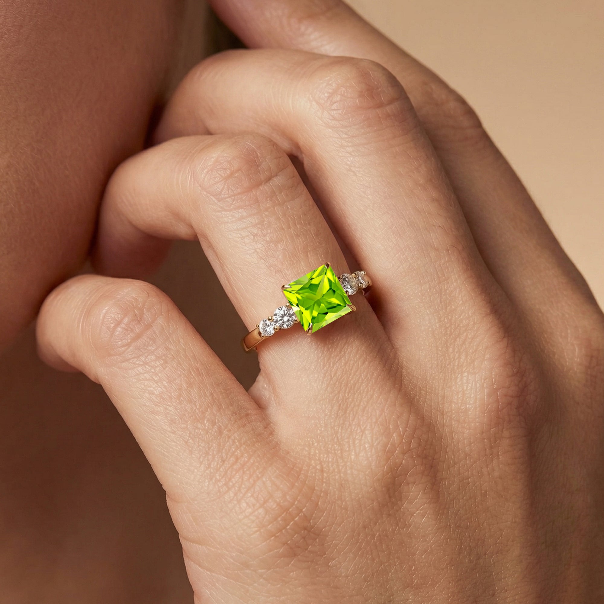 Princess Cut Peridot Graduating Accent Diamond Ring - GeumJewels