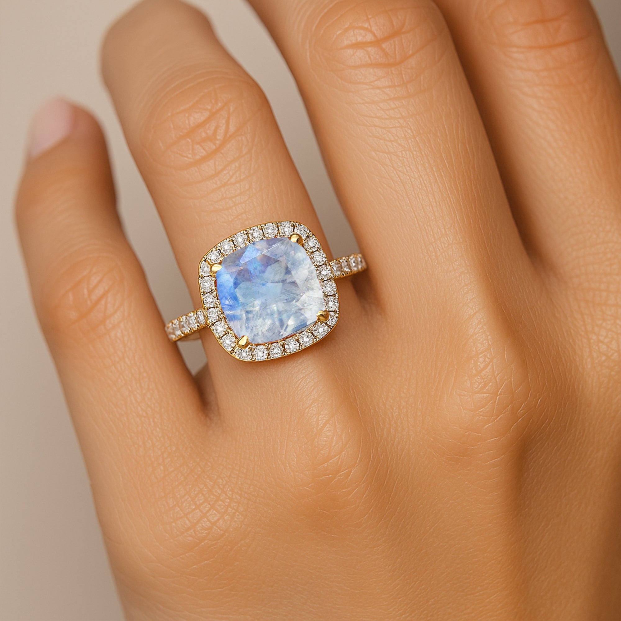 Halo Diamond Engagement Ring with Cushion Cut Moonstone