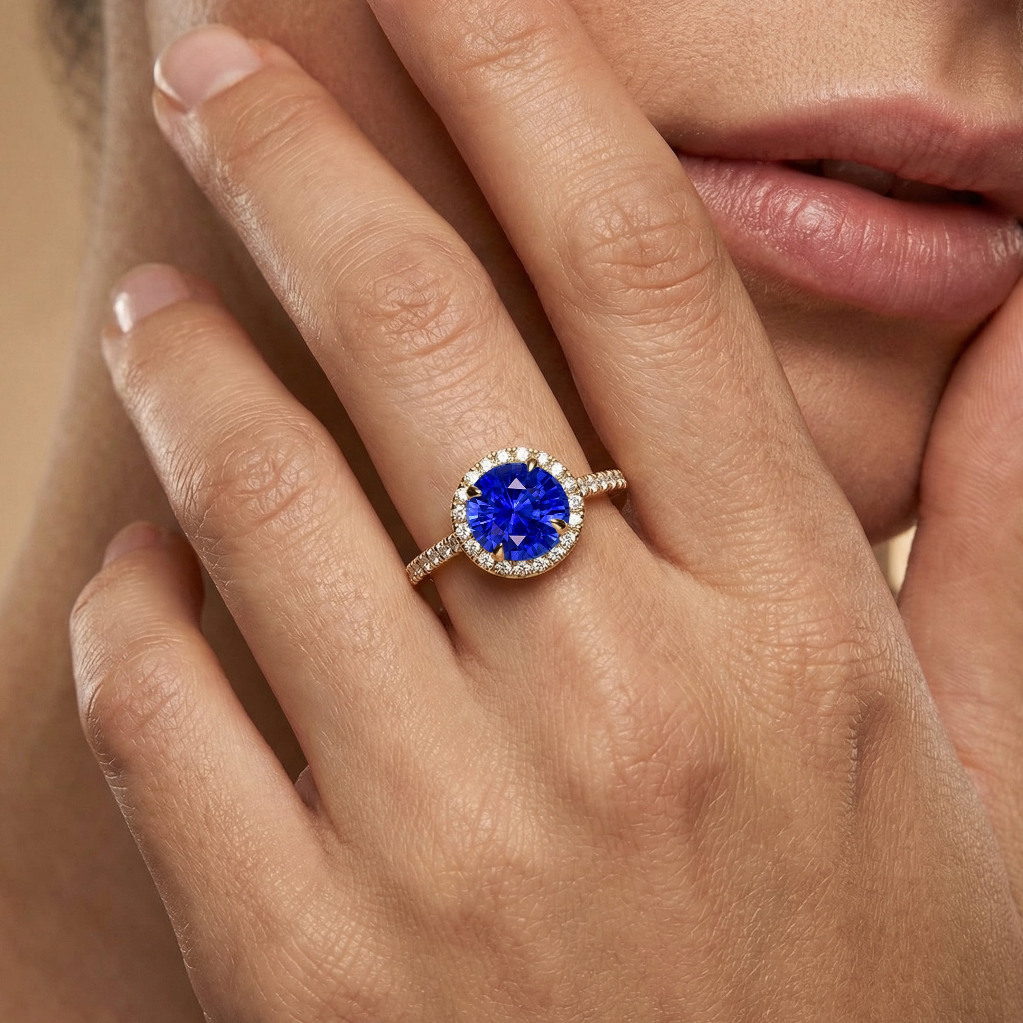 Classic Round Halo Diamonds with Solitaire Blue Sapphire Engagement Ring