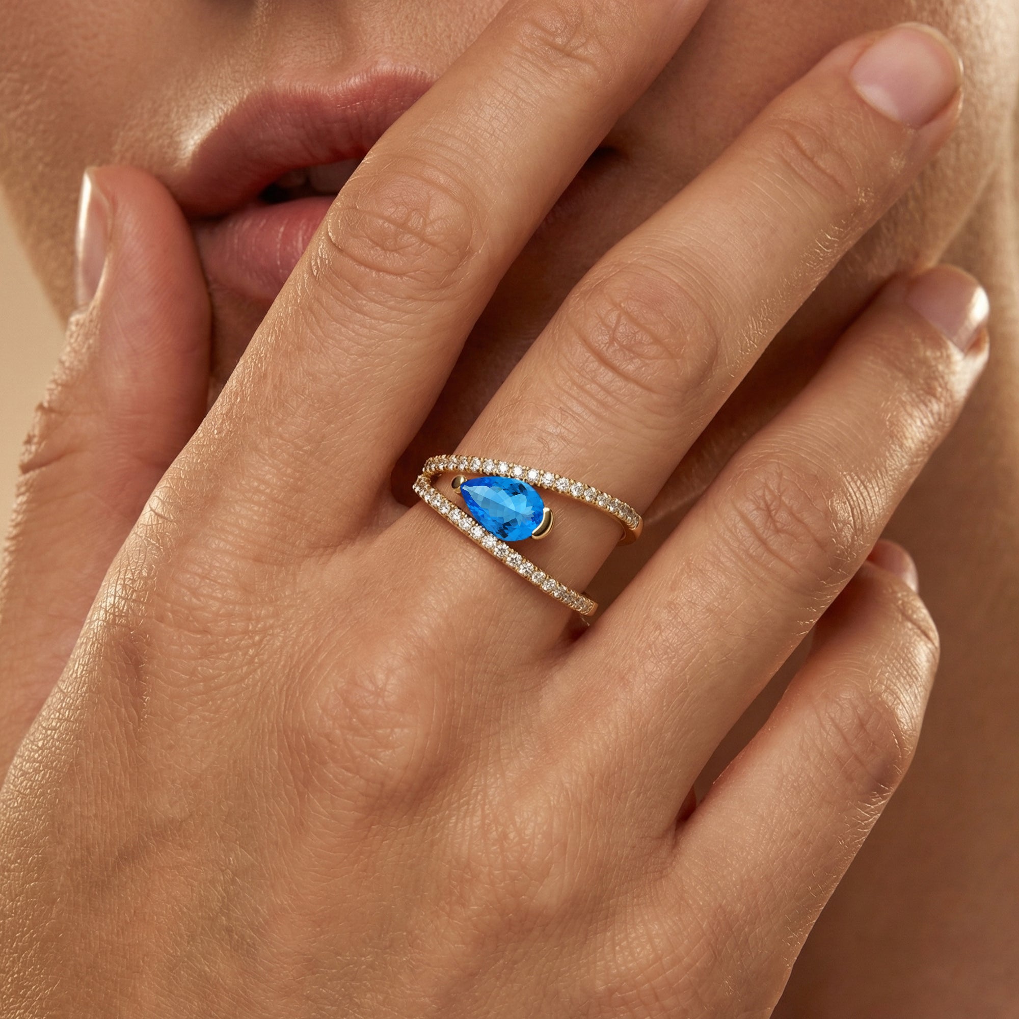 Fashionable V Shaped Diamond Ring with Pear Cut Swiss Blue Topaz