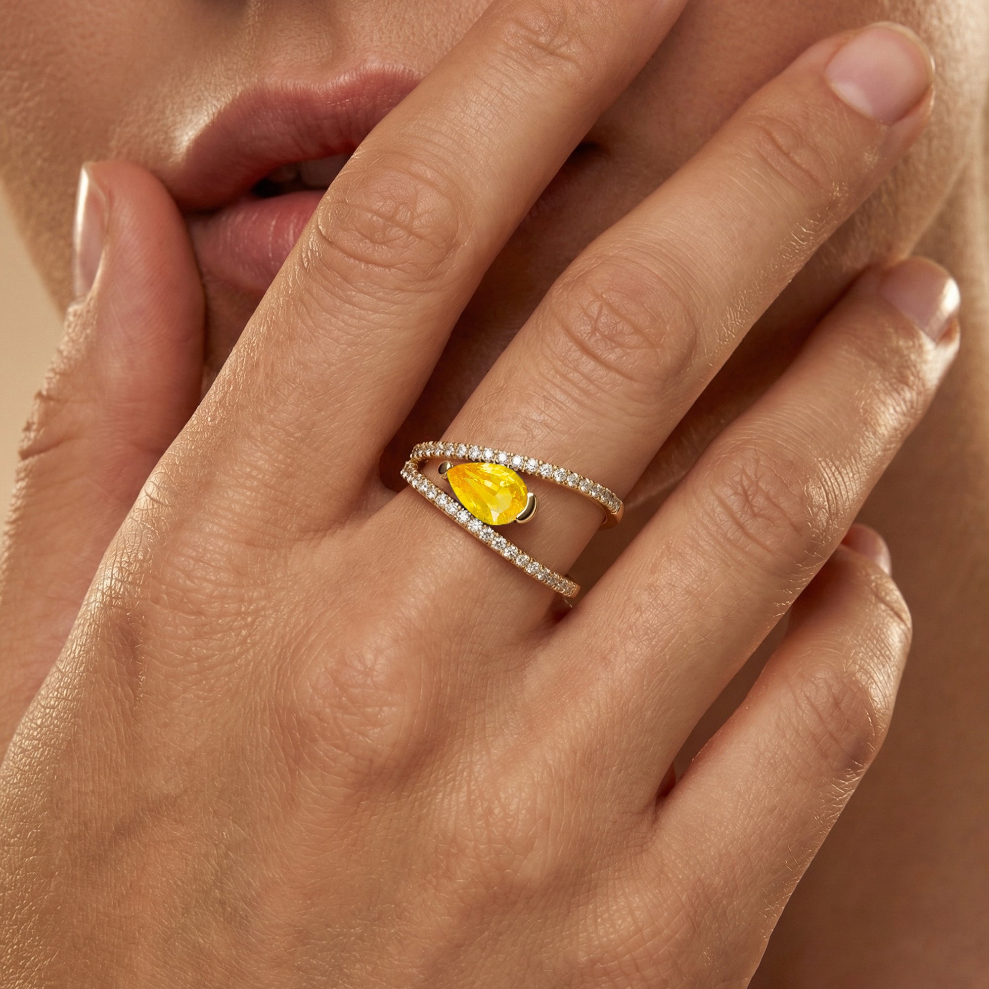 Fashionable V Shaped Diamond Ring with Pear Cut Yellow Sapphire