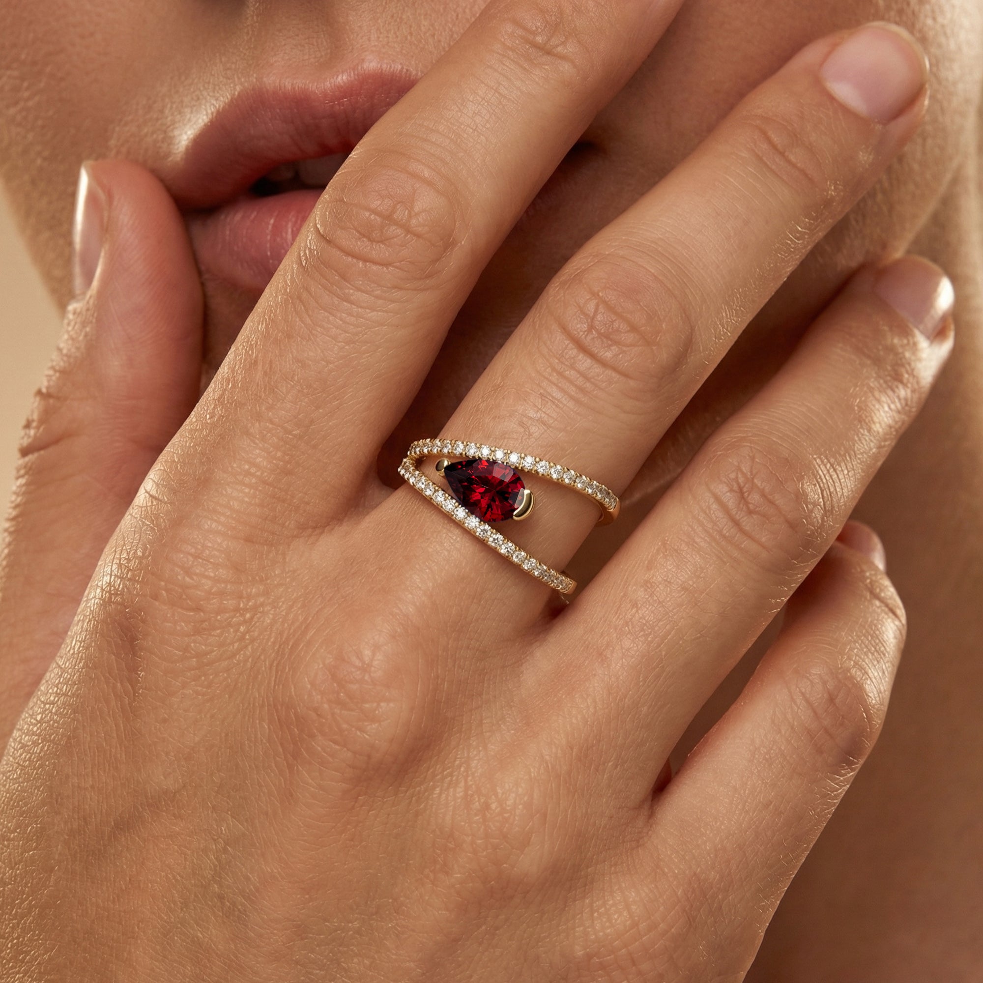 Fashionable V Shaped Diamond Ring with Pear Cut Garnet