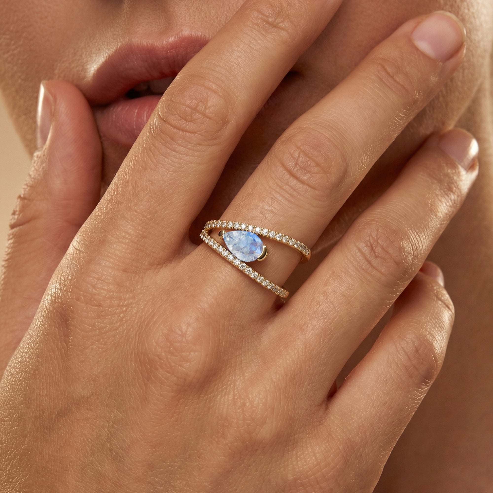 Fashionable V Shaped Diamond Ring with Pear Cut Moonstone