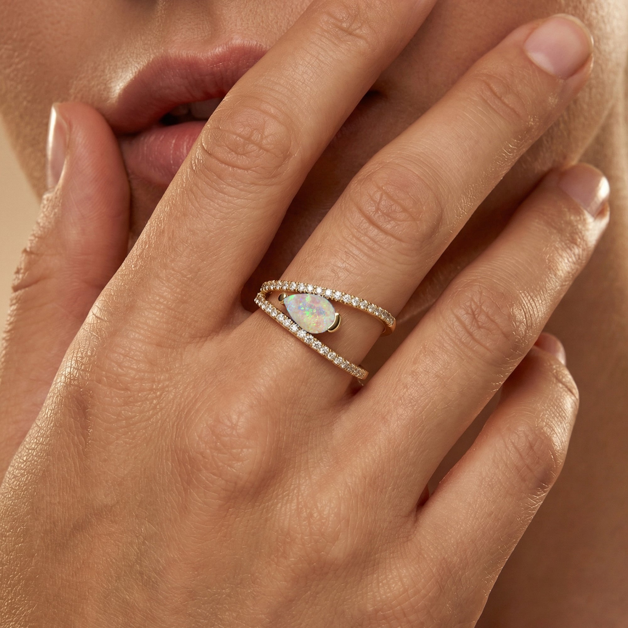 Fashionable V Shaped Diamond Ring with Pear Cut Opal
