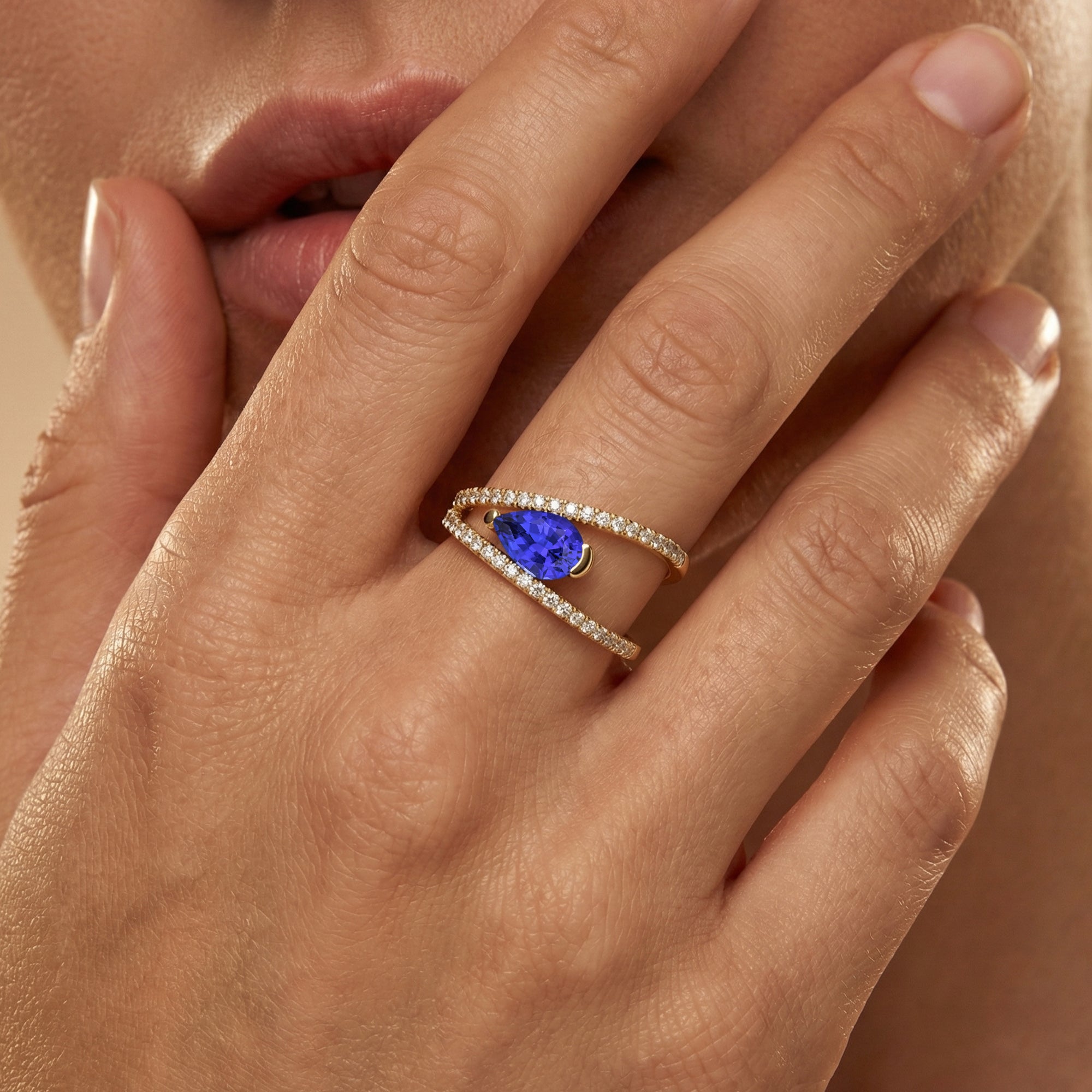 Fashionable V Shaped Diamond Ring with Pear Cut Tanzanite