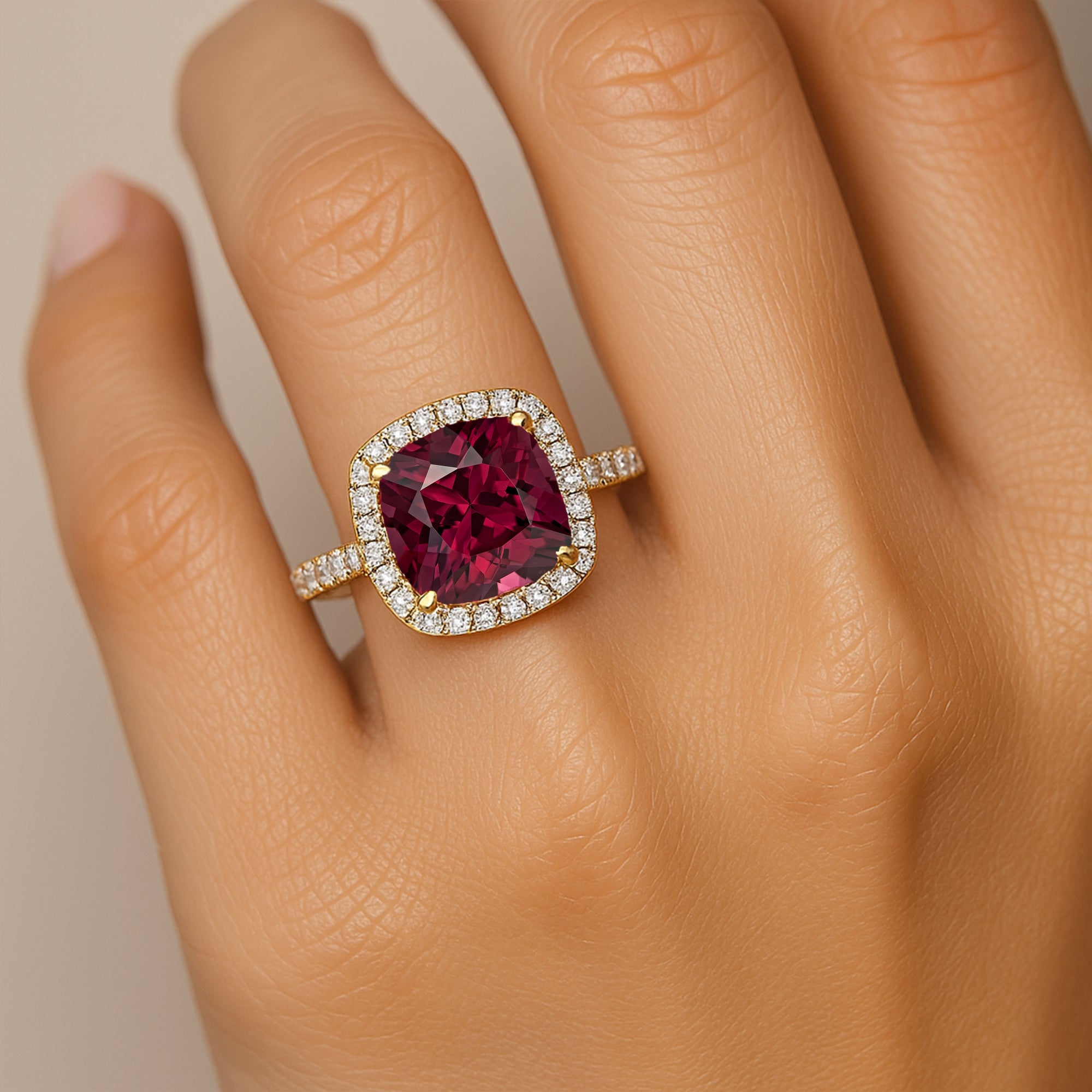 Halo Diamond Engagement Ring with Cushion Cut Garnet