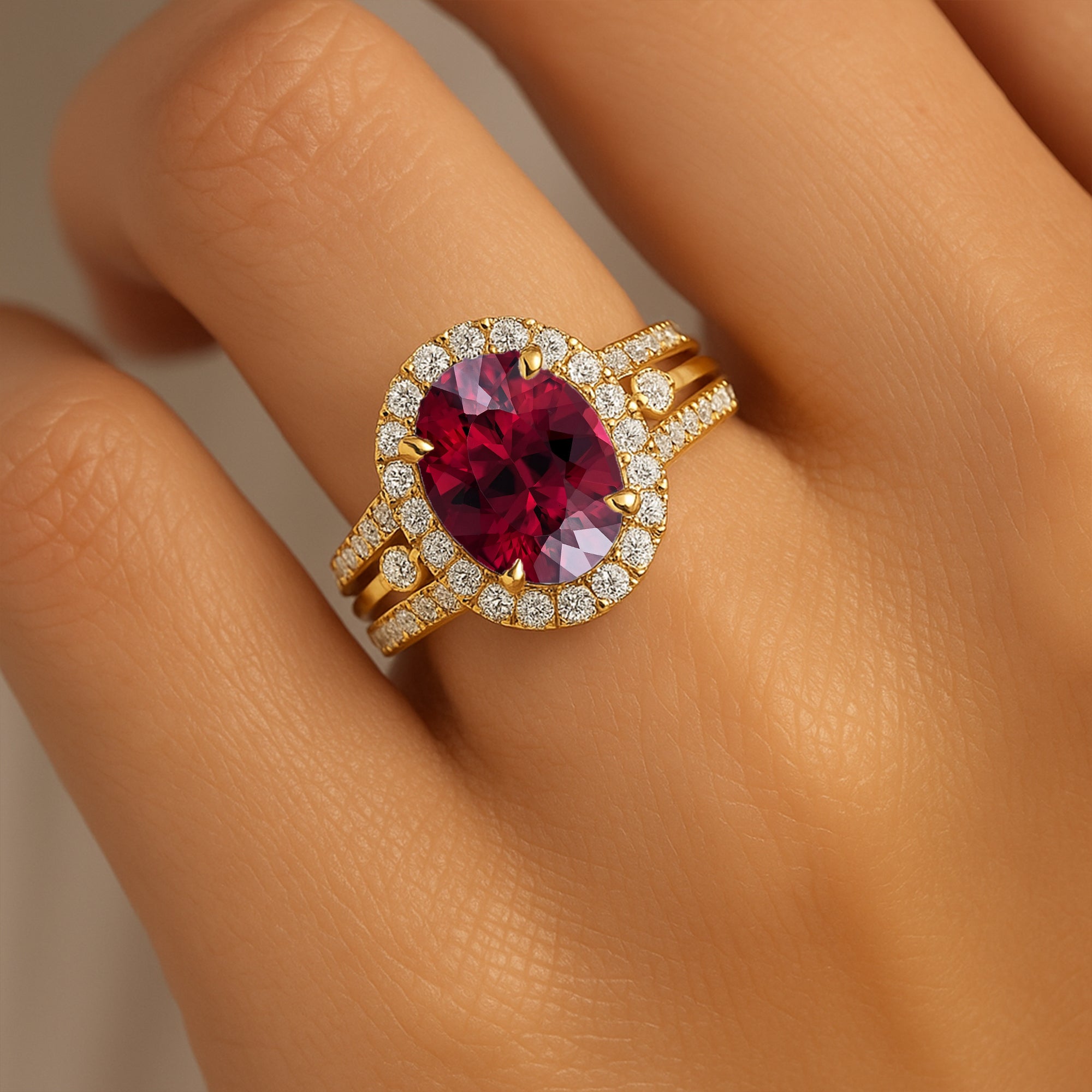 Solitaire Oval Garnet Split Shank Diamond Engagement Ring