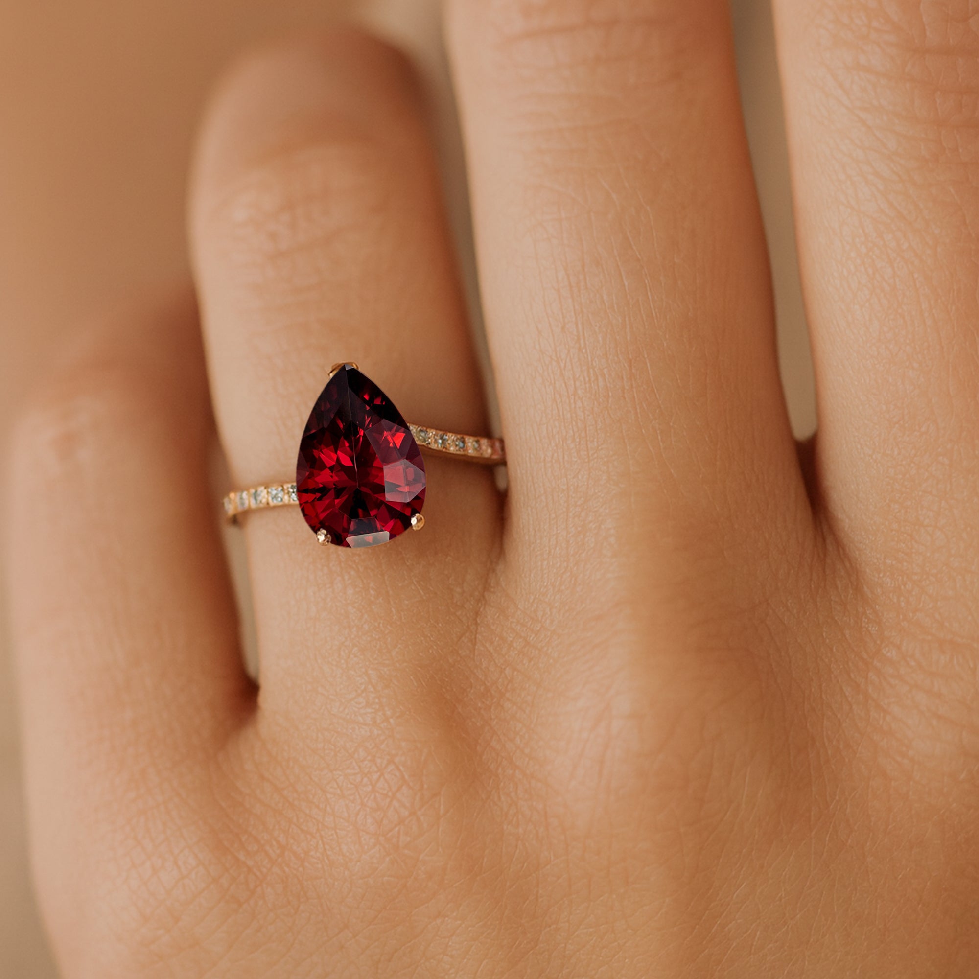 Twisted Up Down Band Pear Shaped Garnet Ring with Accent Diamonds