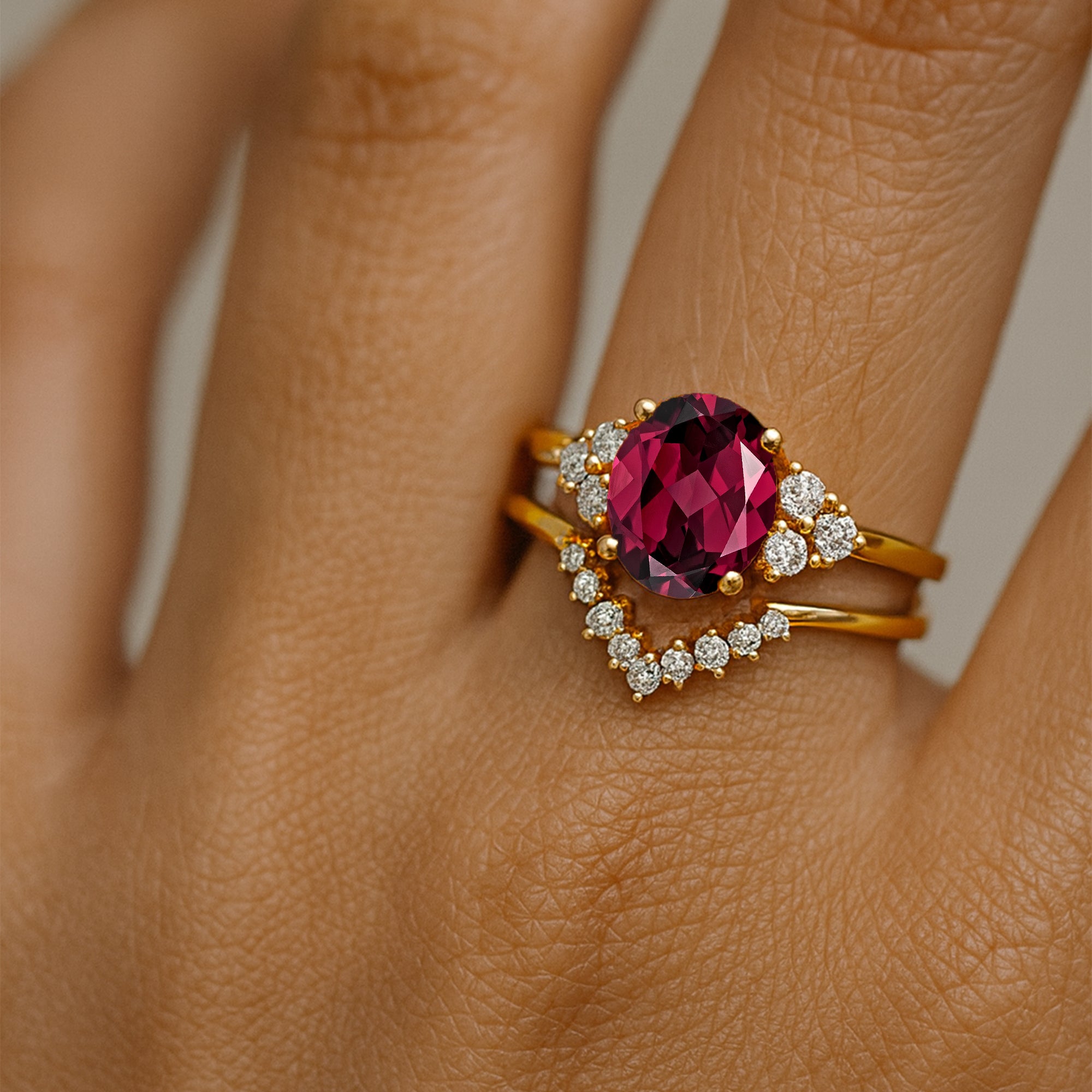 Garnet Solitaire Gold Ring With Stackable Diamond Band