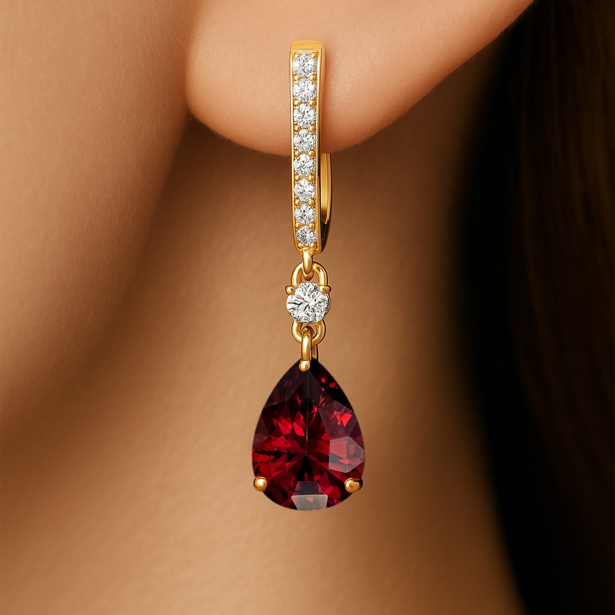 Lever Back Diamond Drop Earrings with Pear Cut Garnet