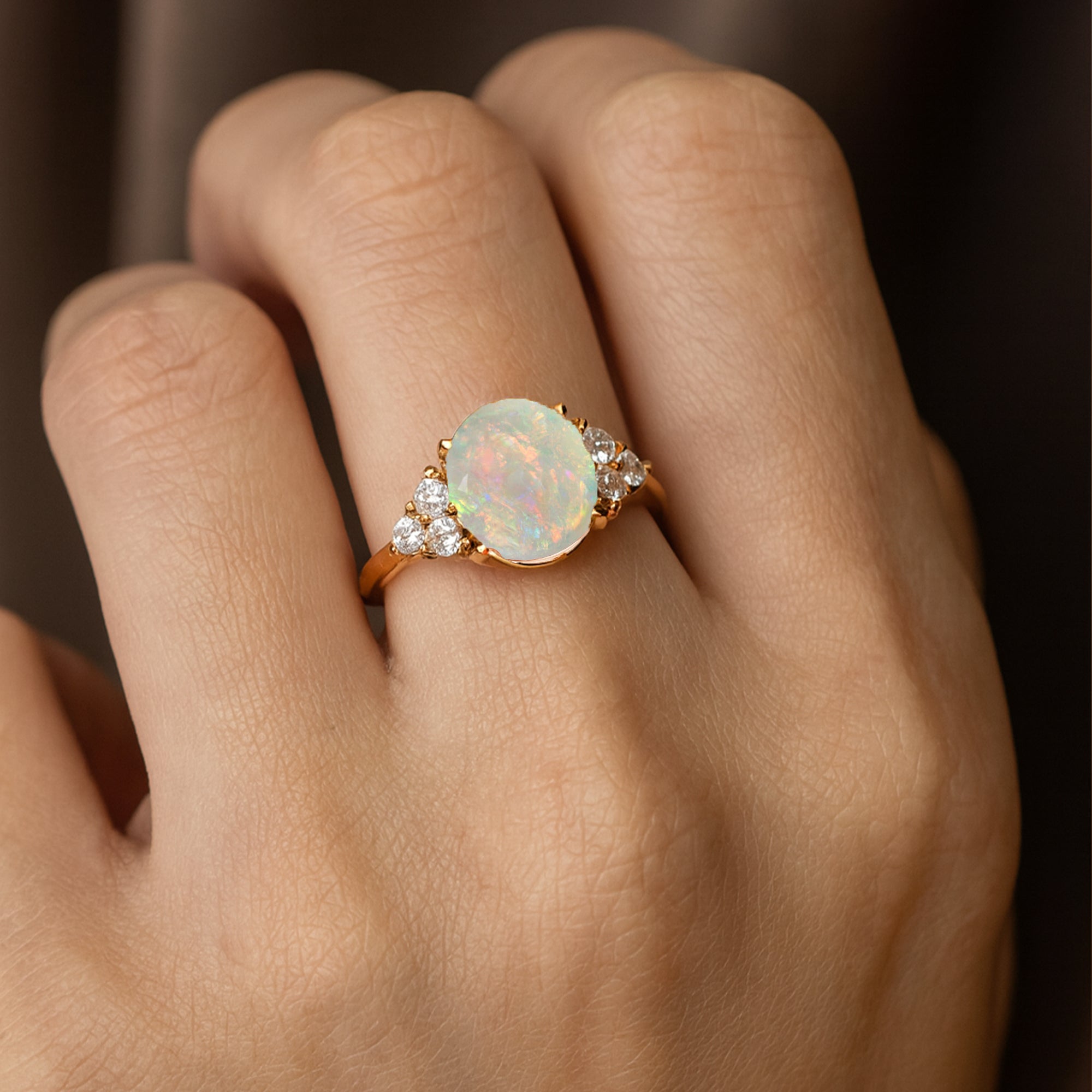 Trio Diamond Engagement Ring with Oval Cut Opal