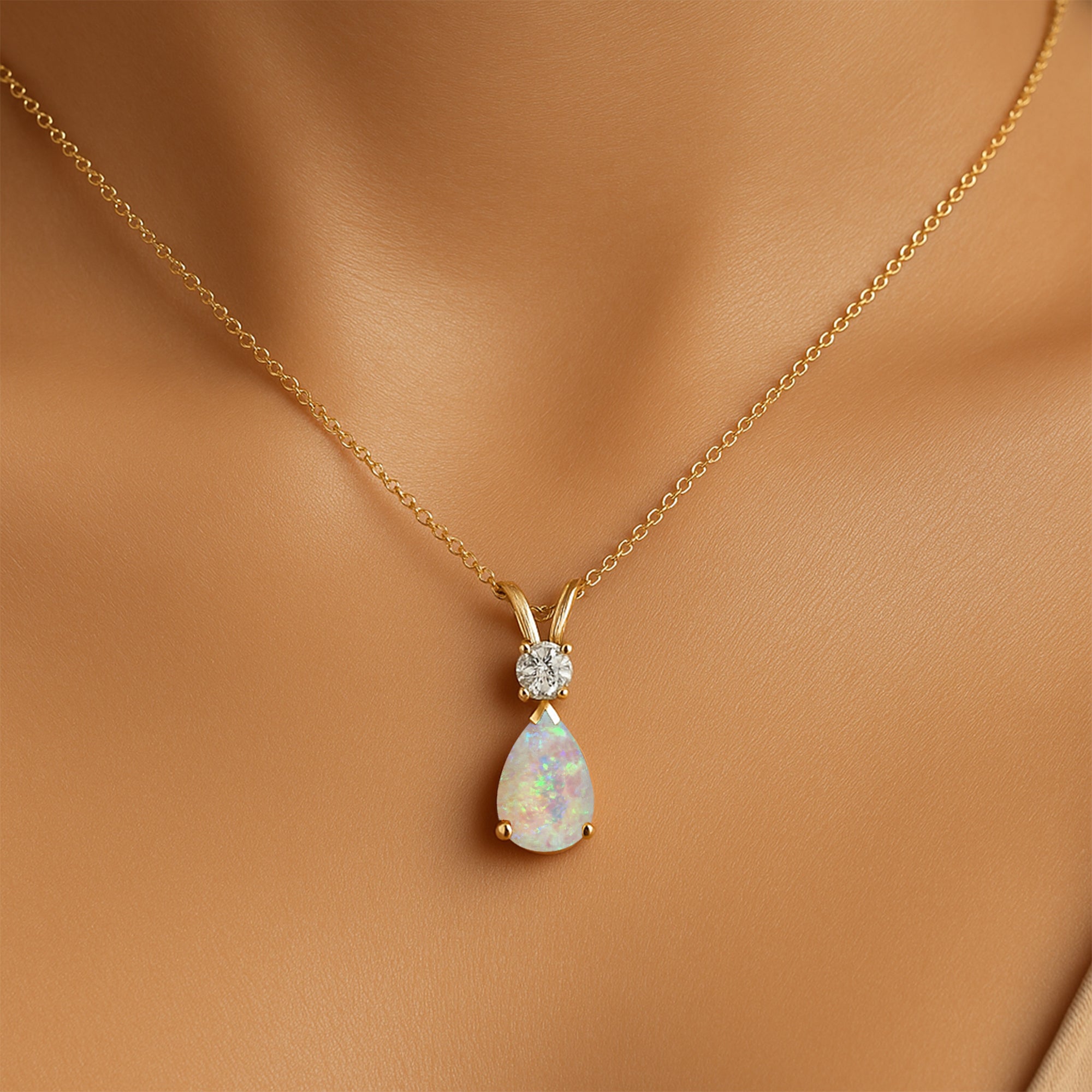 Classic Teardrop Shaped Opal Halo Diamond Dangle Pendant