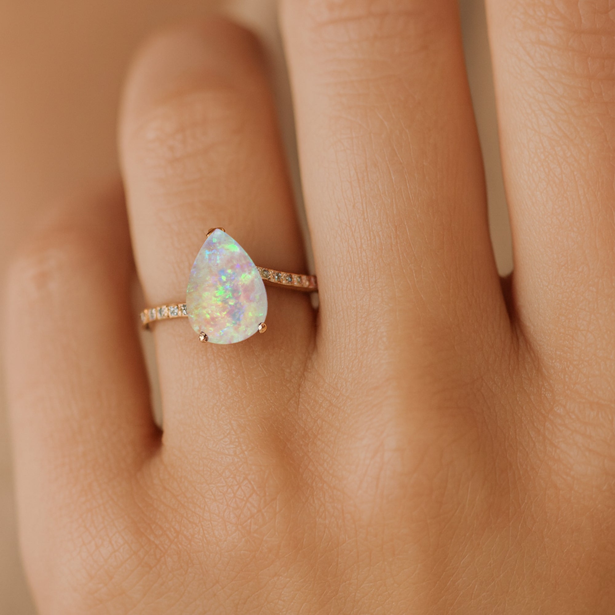 Classic Pear Shaped Opal Halo Diamond Engagement Ring