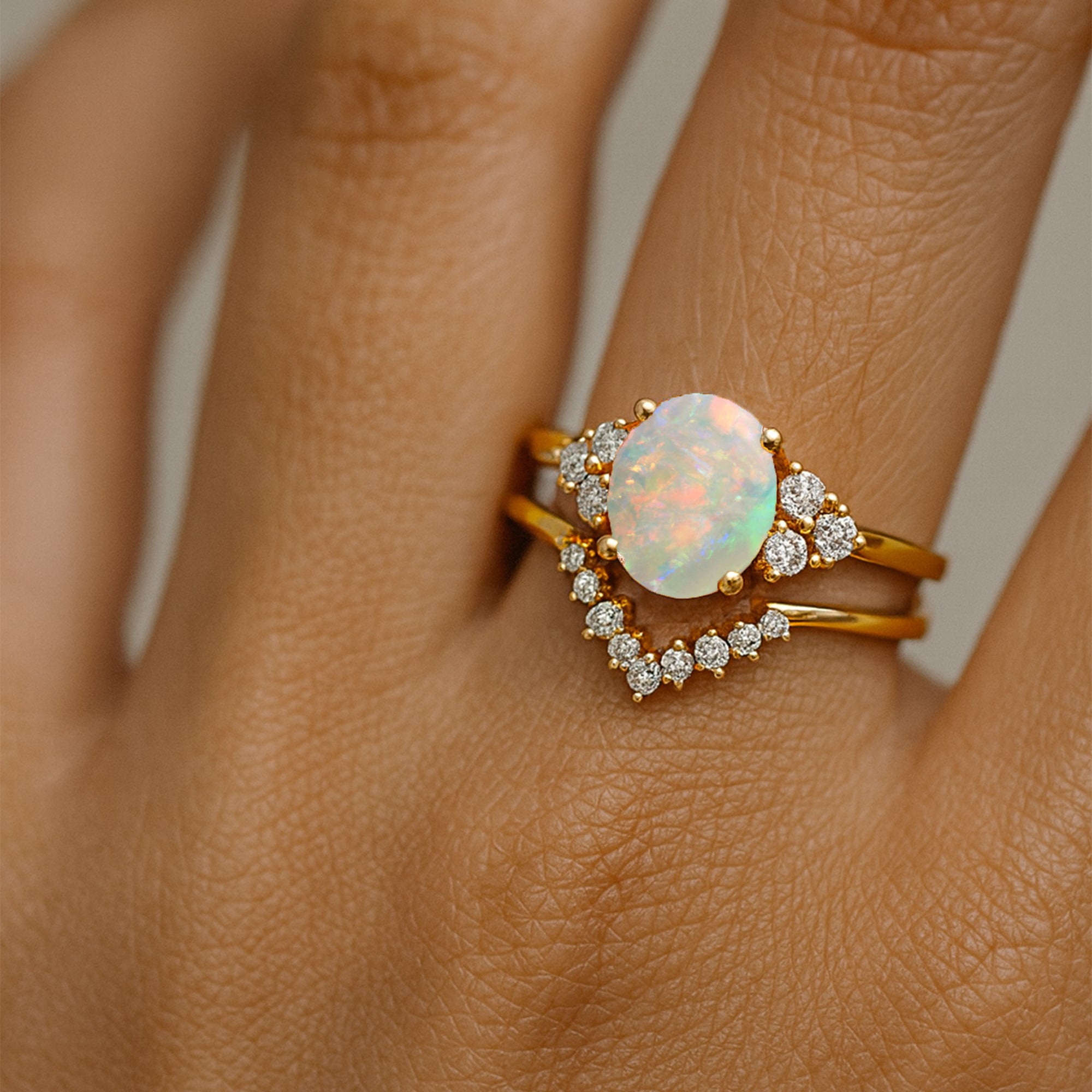 Opal Solitaire Gemstone Ring with Stackable Diamond Band