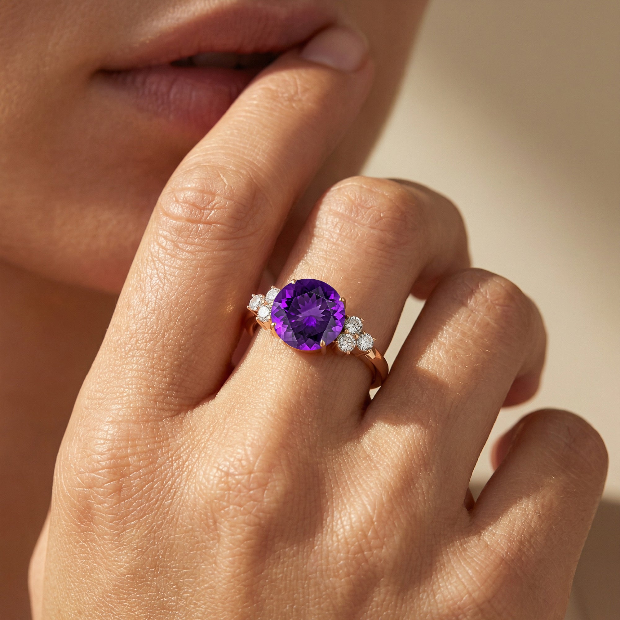 Trio Diamond Engagement Ring with Round Solitaire Amethyst