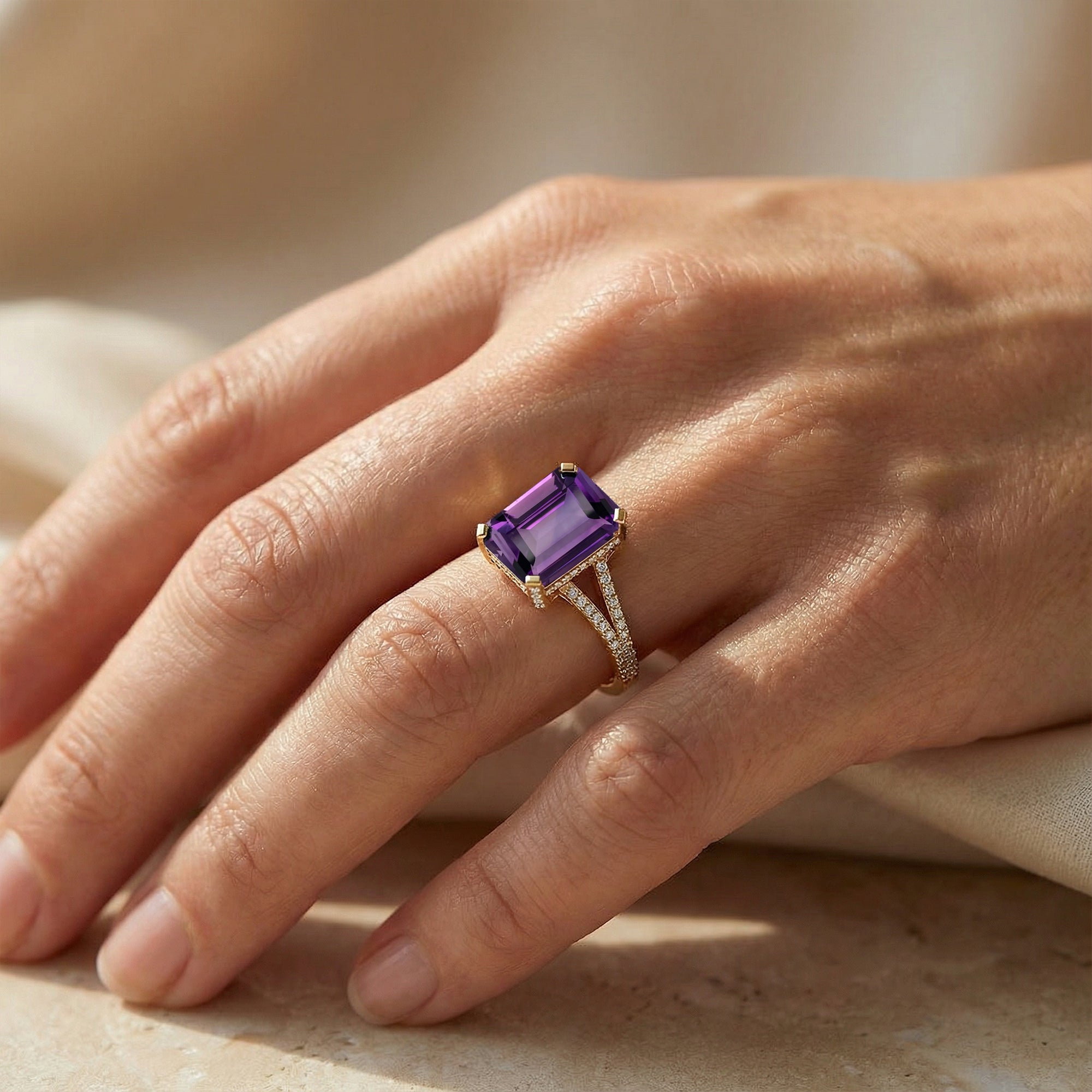 Emerald Cut Amethyst Split Shank Engagement Ring with Diamonds