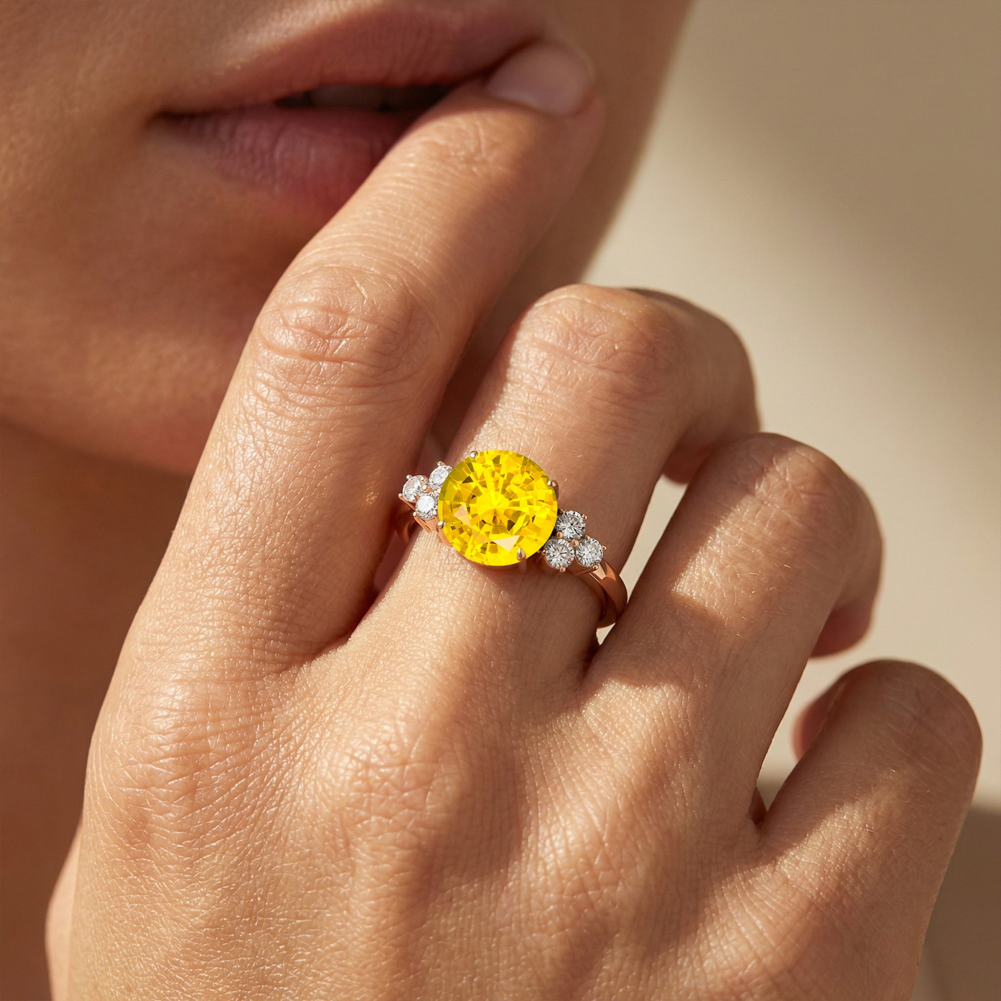 Trio Diamond Engagement Ring with Round Solitaire Yellow Sapphire