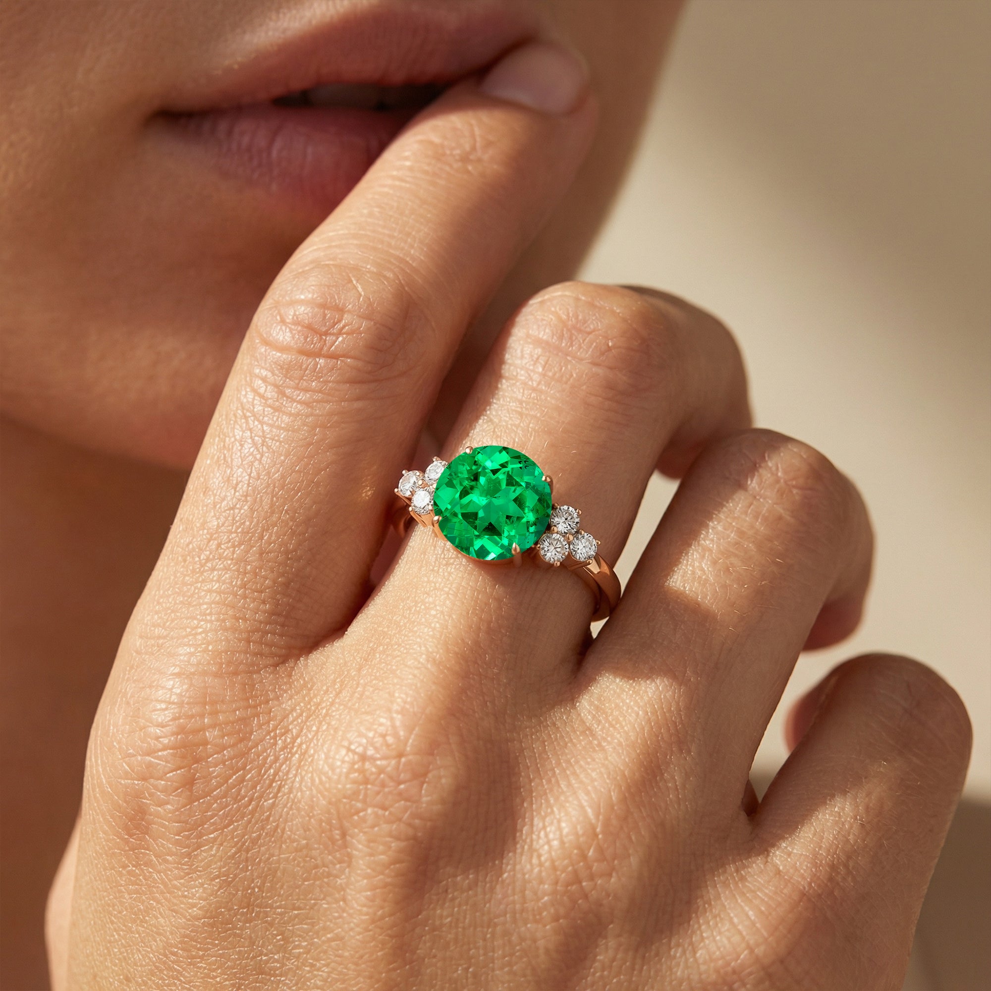 Trio Diamant Verlobungsring mit rundem Solitär-Smaragd