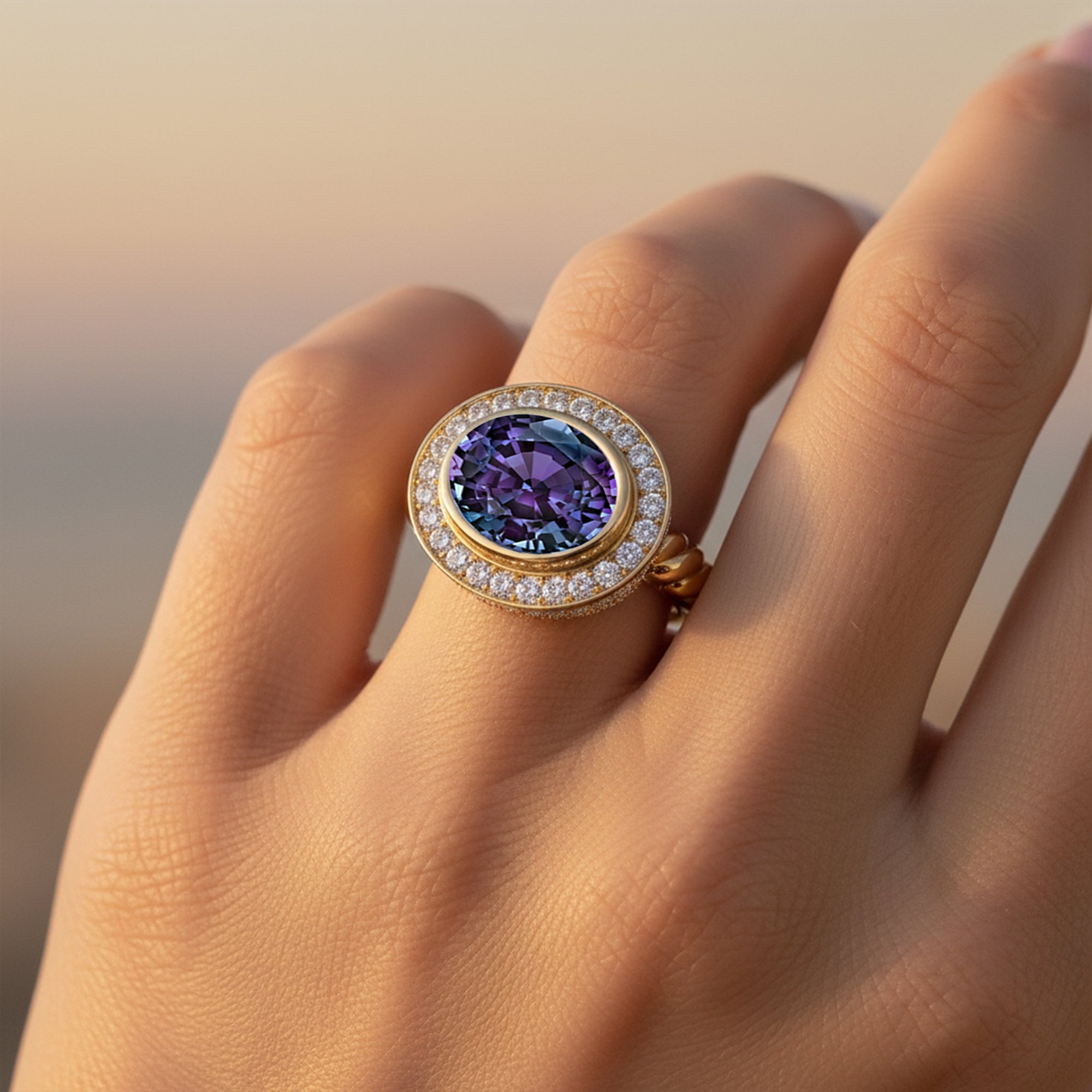 Vintage-Stil Elongierter ovaler Alexandrit Halo Diamant verdrehter Ring