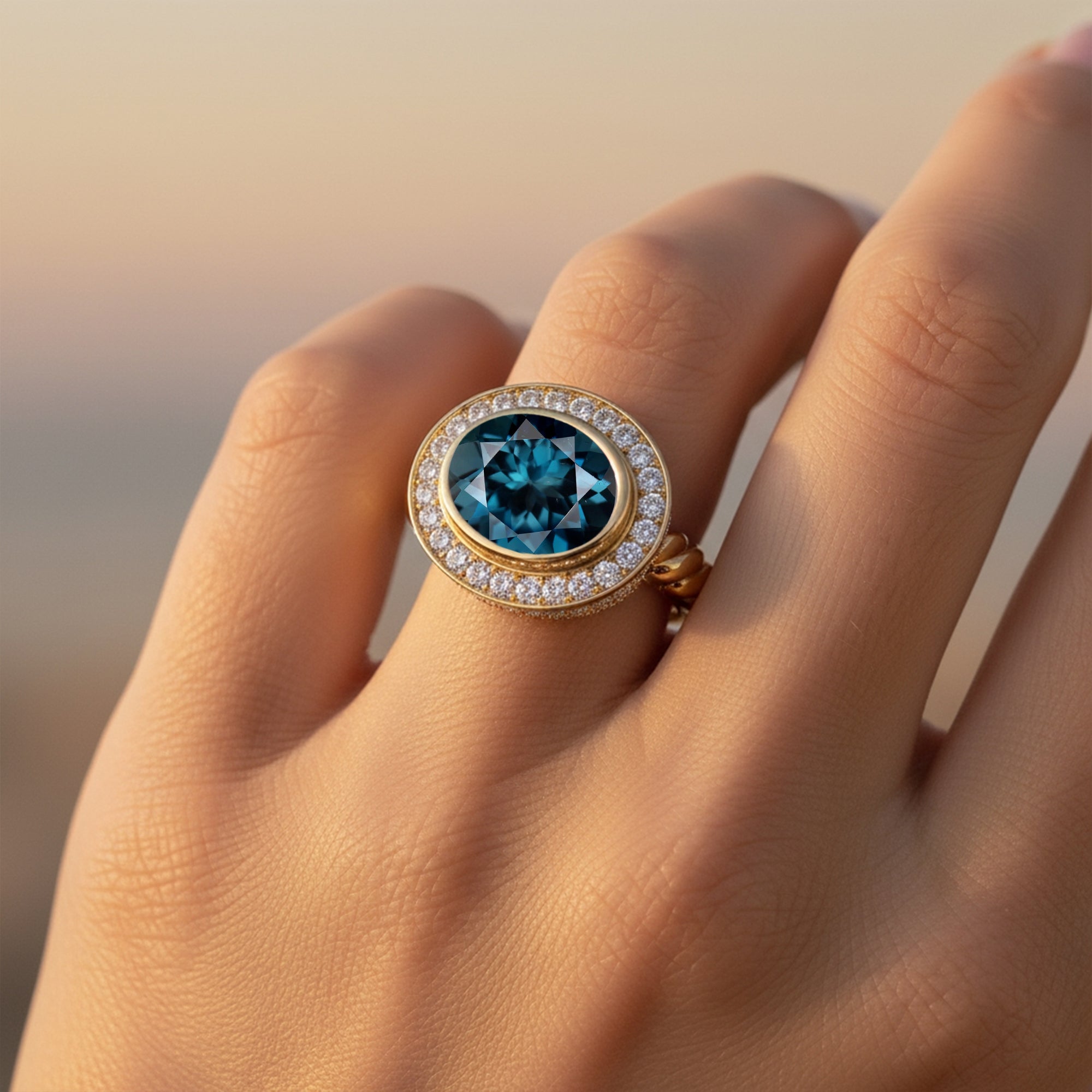 Fachmännisch gefertigt mit einem Vintage-inspirierten länglichen ovalen London Blue Topas, strahlt dieser verdrehte Halo-Diamantring Luxus und Eleganz aus. Perfekt für jeden Anlass, ist der tiefblaue Edelstein in einem atemberaubenden Halo aus Diamanten gefasst, was ihn zu einem Must-have für Liebhaber von Edelsteinringen macht. Erhöhen Sie Ihren Stil mit diesem einzigartigen und atemberaubenden Schmuckstück.