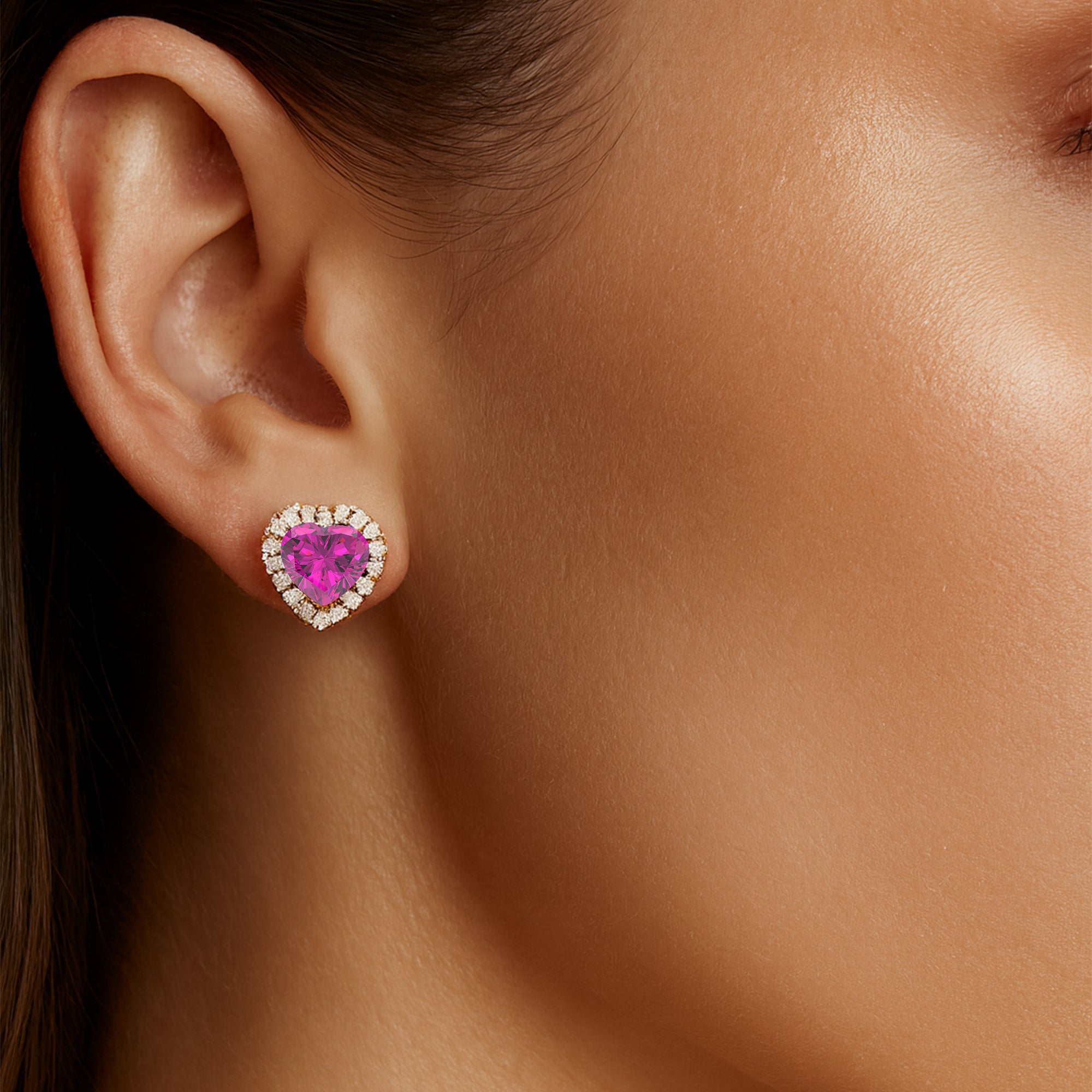 Heart Shaped Pink Sapphire Halo Diamond Stud Earrings - GeumJewels