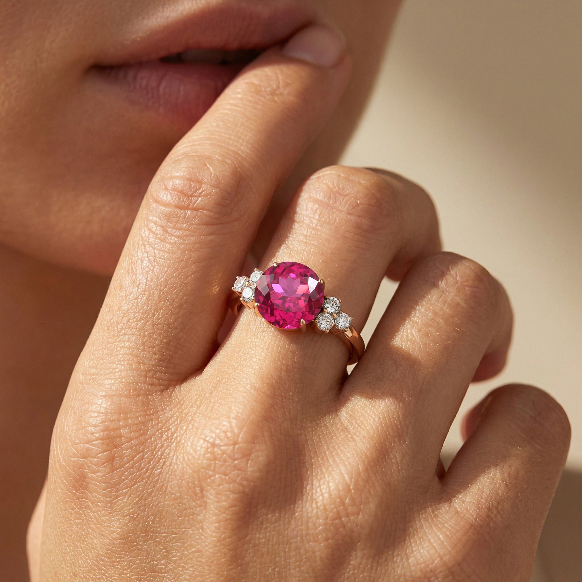 Trio Diamond Engagement Ring with Round Solitaire Pink Sapphire - GeumJewels