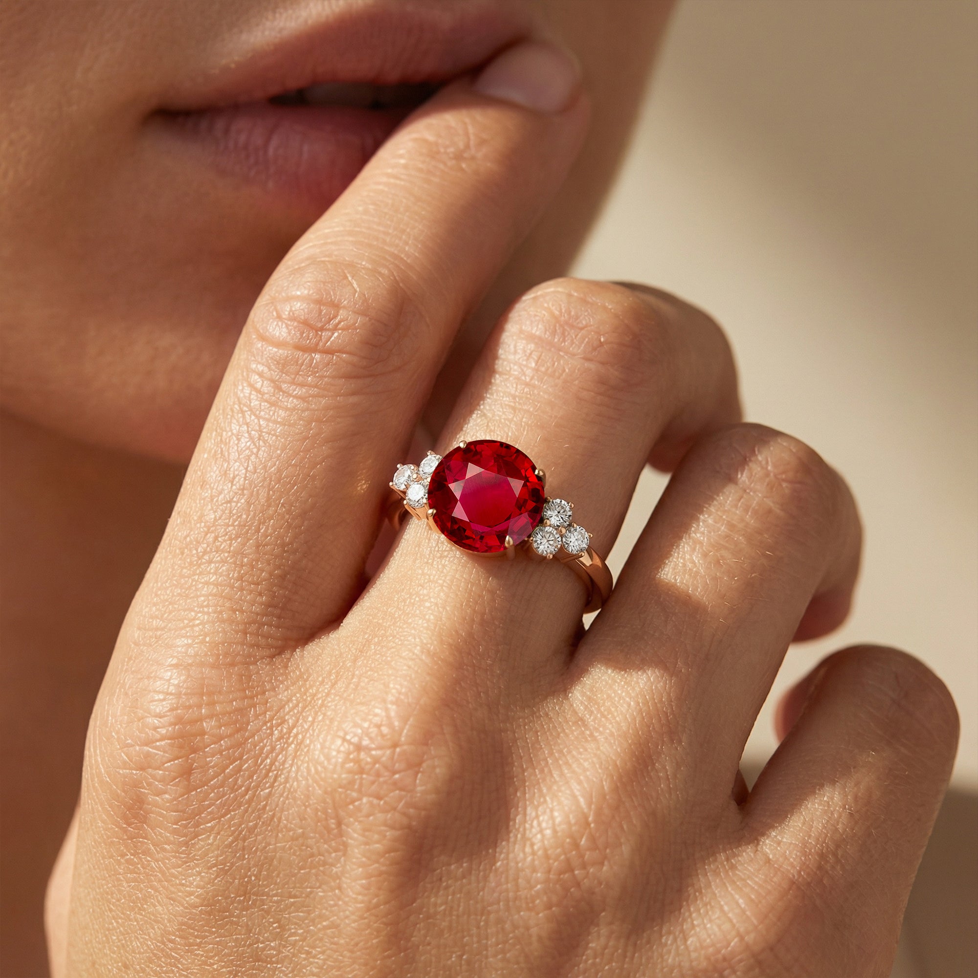 Trio Diamond Engagement Ring with Round Solitaire Ruby - GeumJewels