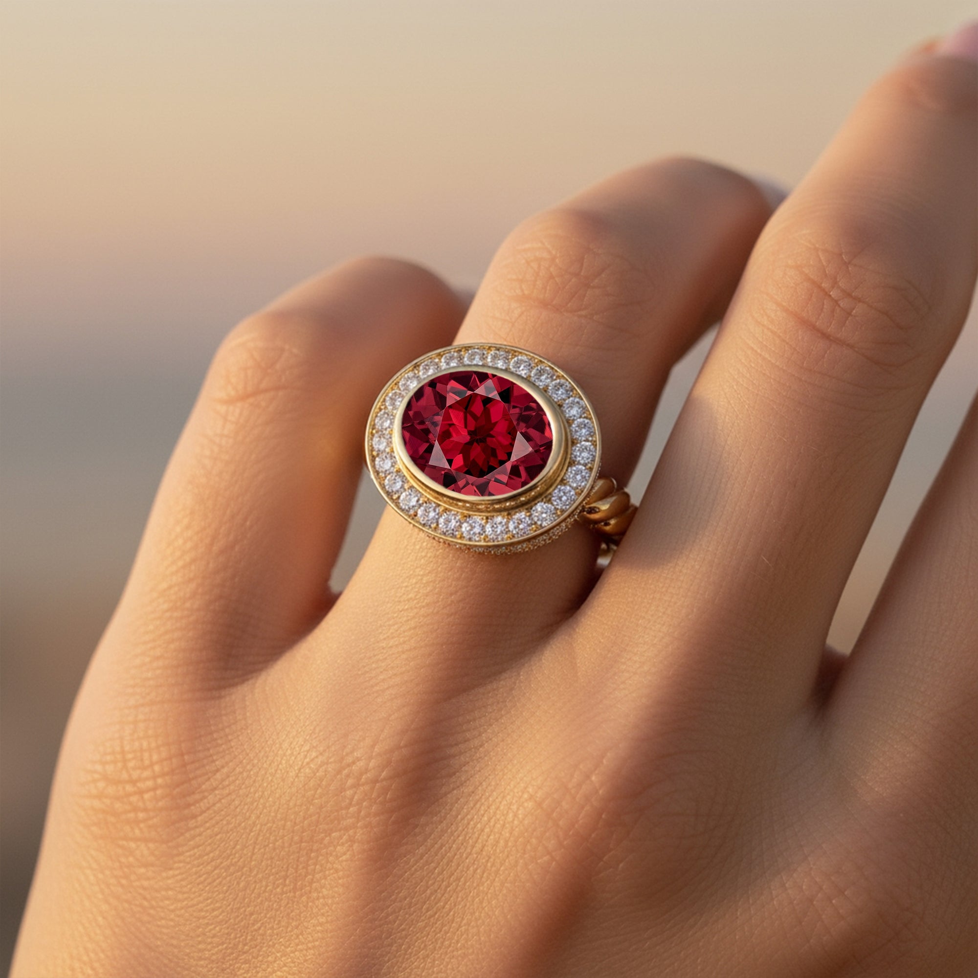 Anillo Trenzado con Halo de Diamantes y Granate Ovalado Alargado Estilo Vintage