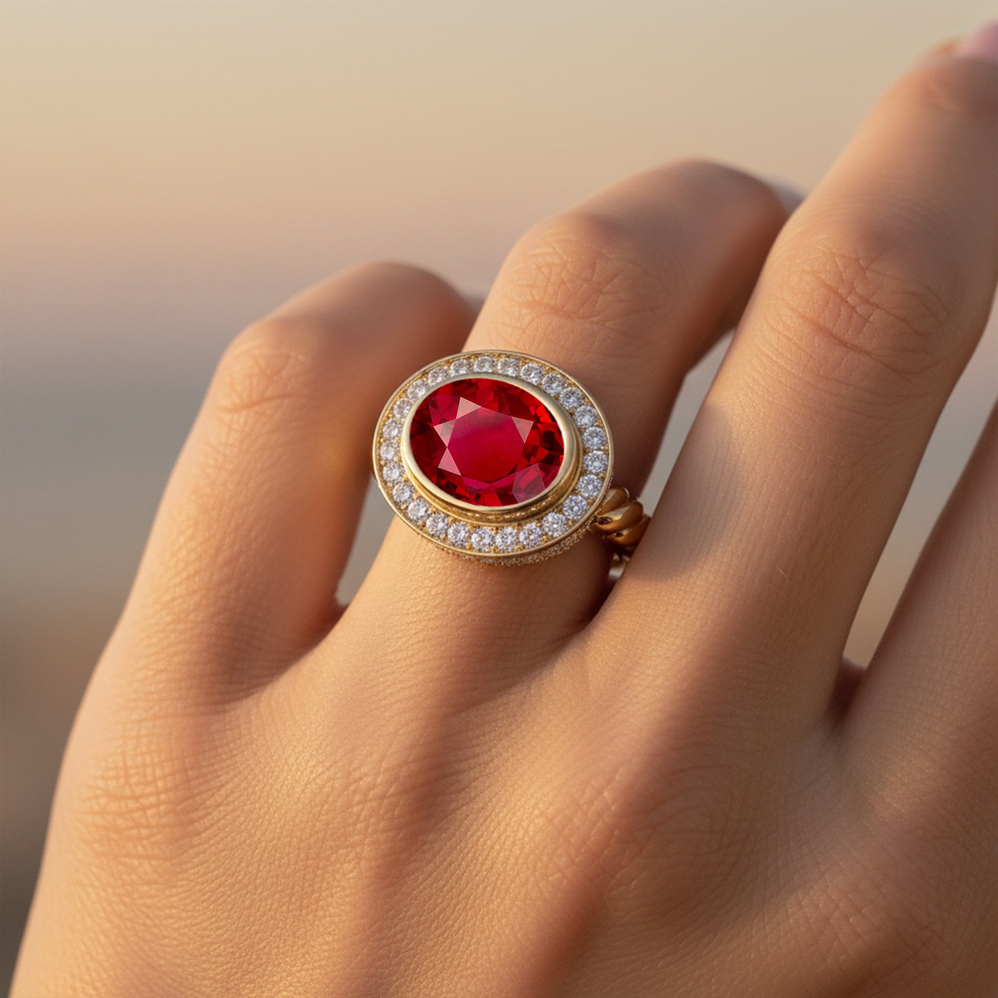Este anillo de diamantes con halo de rubí ovalado de estilo vintage combina elegancia y sofisticación. La forma ovalada alargada exhibe el vibrante rubí de julio rojo, complementado por un halo de diamantes redondos brillantes. Este anillo de piedras preciosas es perfecto para añadir un toque de lujo a cualquier conjunto.