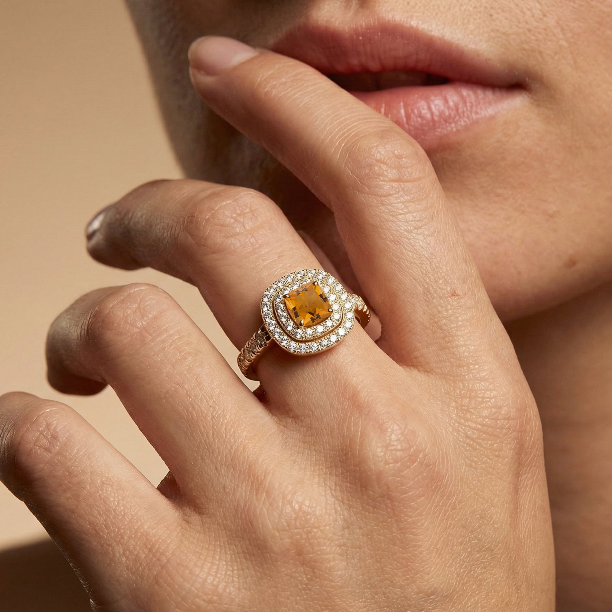 Double Halo Diamond Cushion Cut Citrine Ring - GeumJewels