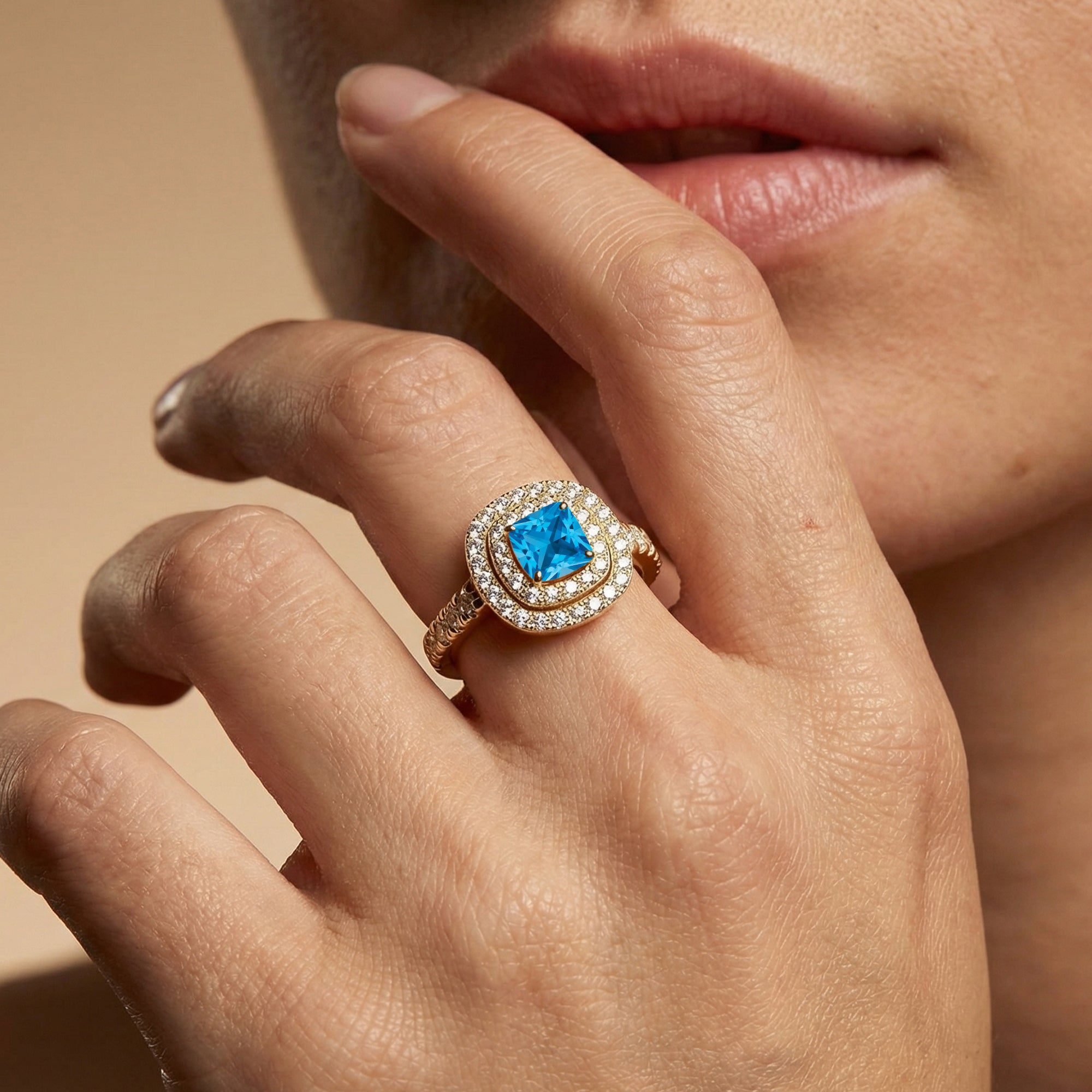 Double Halo Diamond Cushion Cut Swiss Blue Topaz Ring - GeumJewels