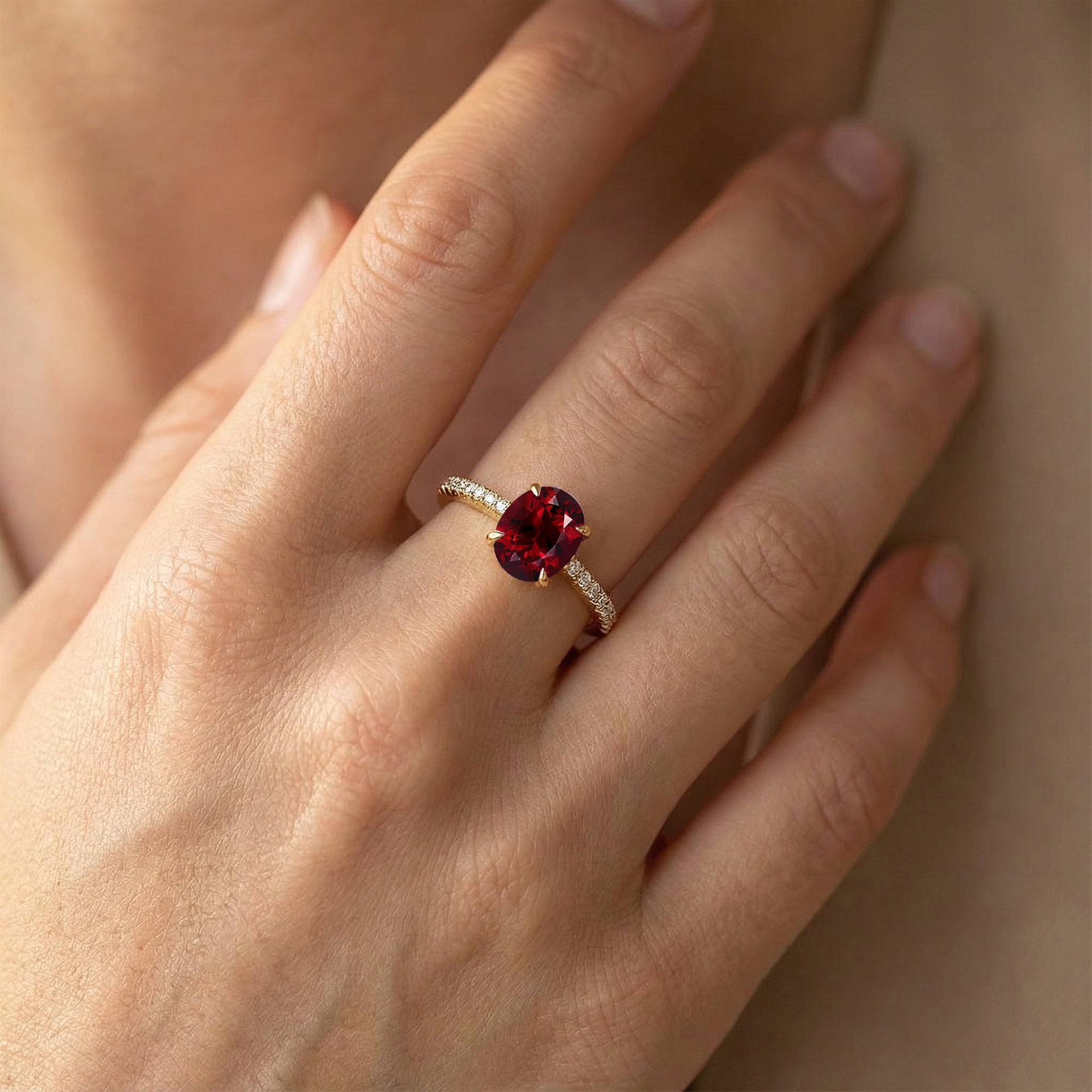 Oval Solitaire Garnet with Accent Diamonds Engagement Ring - GeumJewels