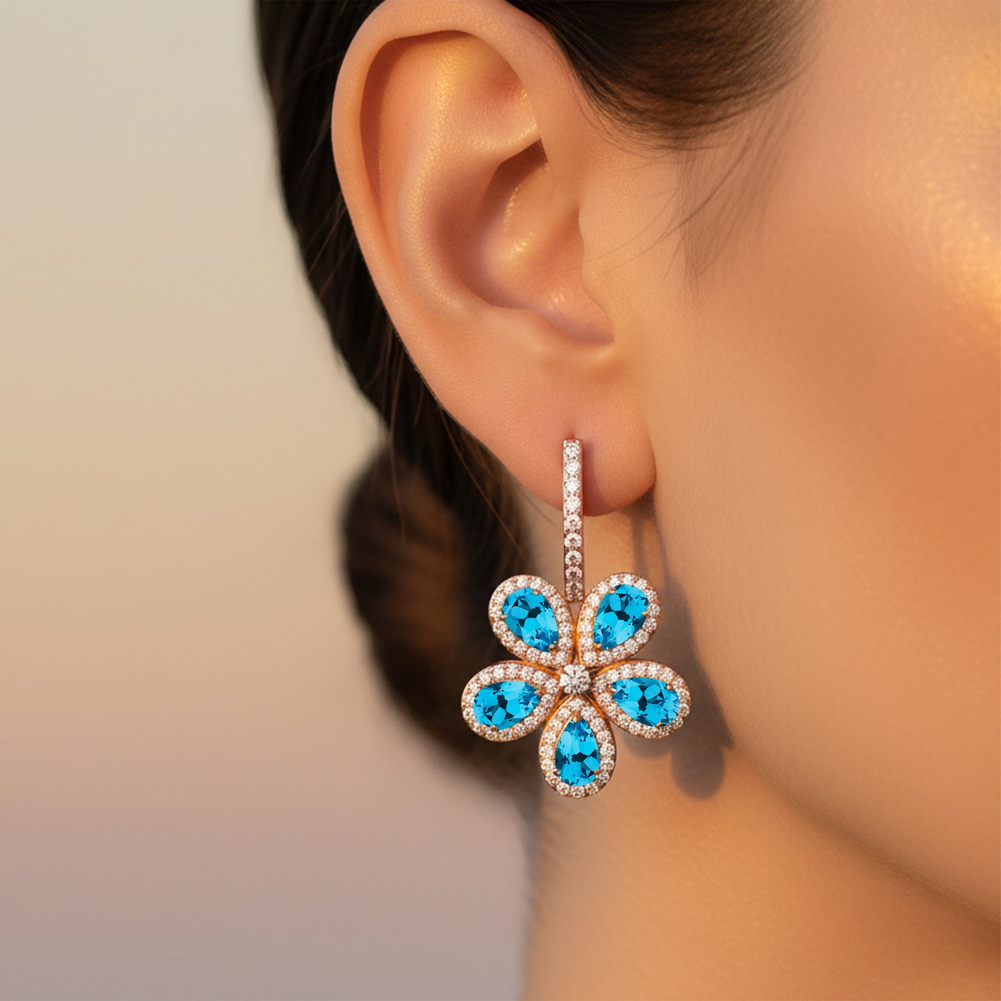 These elegant Leverback earrings feature stunning pear shaped Swiss Blue Topaz gemstones, highlighted by a delicate flower-shaped diamond setting. Made with high quality NOV-Swiss Blue Topaz, these earrings are sure to add a touch of sophistication and sparkle to any outfit.
